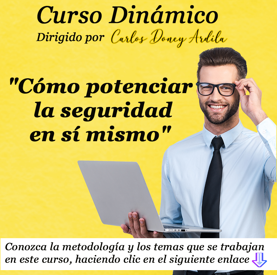 En este curso dinámico denominado “Cómo potenciar la seguridad en sí mismo” encontrarás: 1 archivo con las recomendaciones para que este curso te sea más productivo; 4 videos, 1 texto, 1 cuestionario, 1 plan de acción, 1 enlace para que participes en el foro el último sábado de cada mes; y además recibes el acompañamiento directamente de su autor Carlos Doney Ardila durante un mes, a partir de la fecha en la que recibes el curso. El citado acompañamiento lo hace el mismo autor desde su correo: incubadoradeempresas@carlosdoneyardila.com Él tiene destinados los días lunes para darte respuestas, a las preguntas o inquietudes que hayas manifestado durante la respectiva semana.