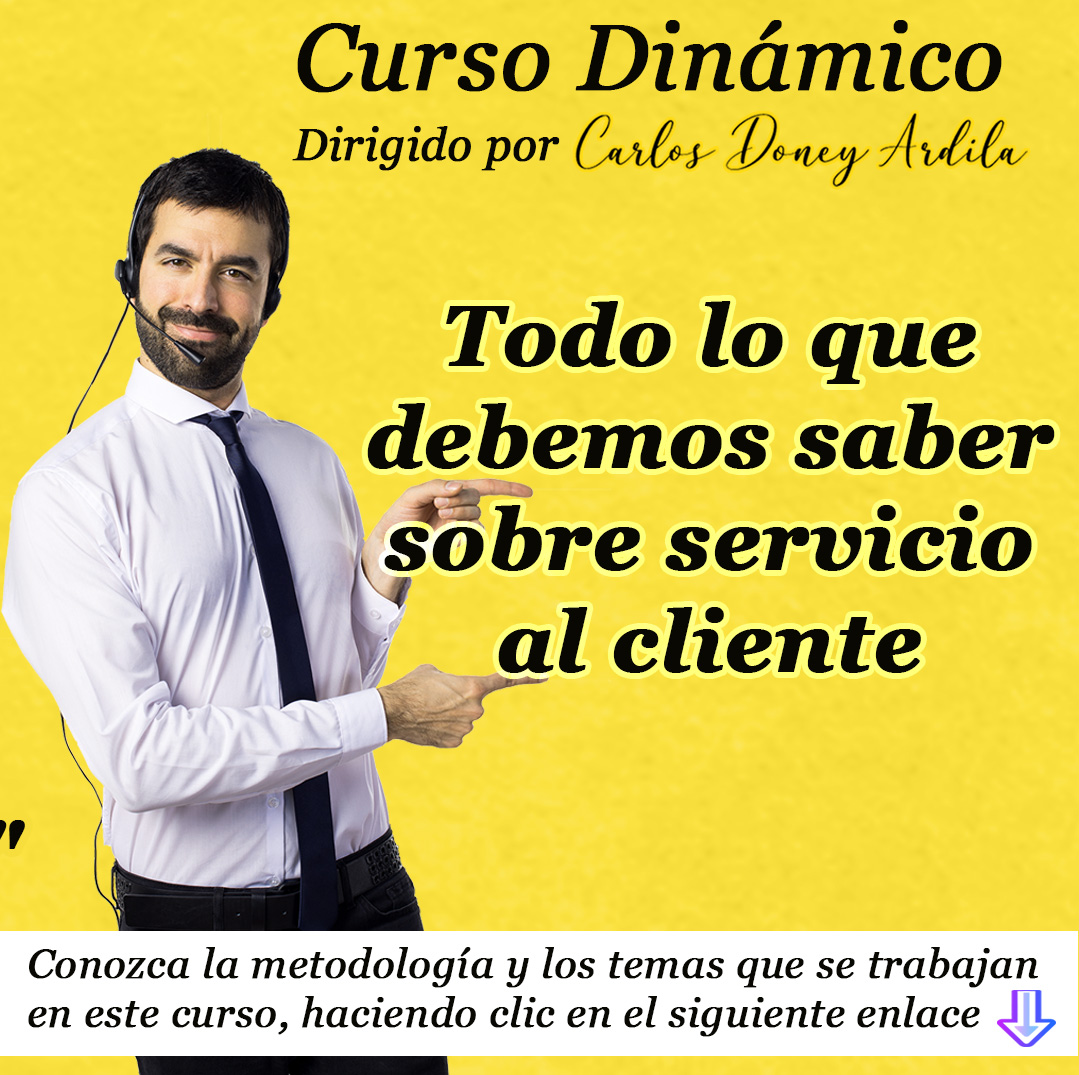 En este curso dinámico denominado “Todo lo que debemos saber sobre servicio al cliente” encontrarás: 1 archivo con las recomendaciones para que este curso te sea más productivo; 4 videos, 1 texto, 1 cuestionario, 1 plan de acción, 1 enlace para que participes en el foro el último sábado de cada mes; y además recibes el acompañamiento directamente de su autor Carlos Doney Ardila durante un mes, a partir de la fecha en la que recibes el curso. El citado acompañamiento lo hace el mismo autor desde su correo: incubadoradeempresas@carlosdoneyardila.com Él tiene destinados los días lunes para darte respuestas, a las preguntas o inquietudes que hayas manifestado durante la respectiva semana.